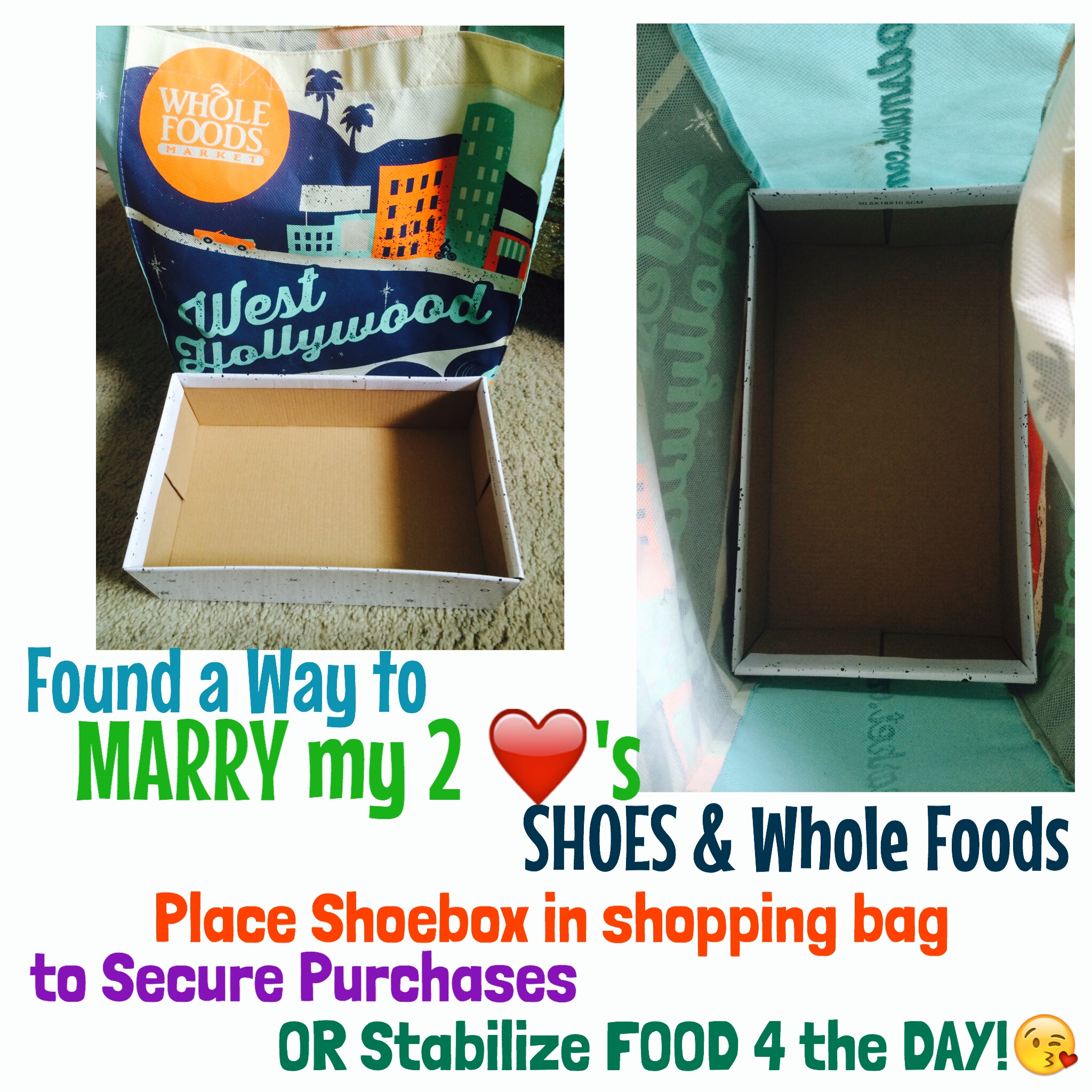 If you choose the right sized shoebox, you can use it as a sturdy base for your reuseable bags to secure your food purchase, OR better yet, you can use the shoebox as a base for your LUNCH BAG. Reuseable bags are perfect for holding my stainless steel water bottles, smoothies & protein rich salads; items I generally take for my daily sustenance. So, in a nutshell, buy shoes from APPARELSAVE & PREMIUM ingredients from WHOLE FOODS & use everything!image
