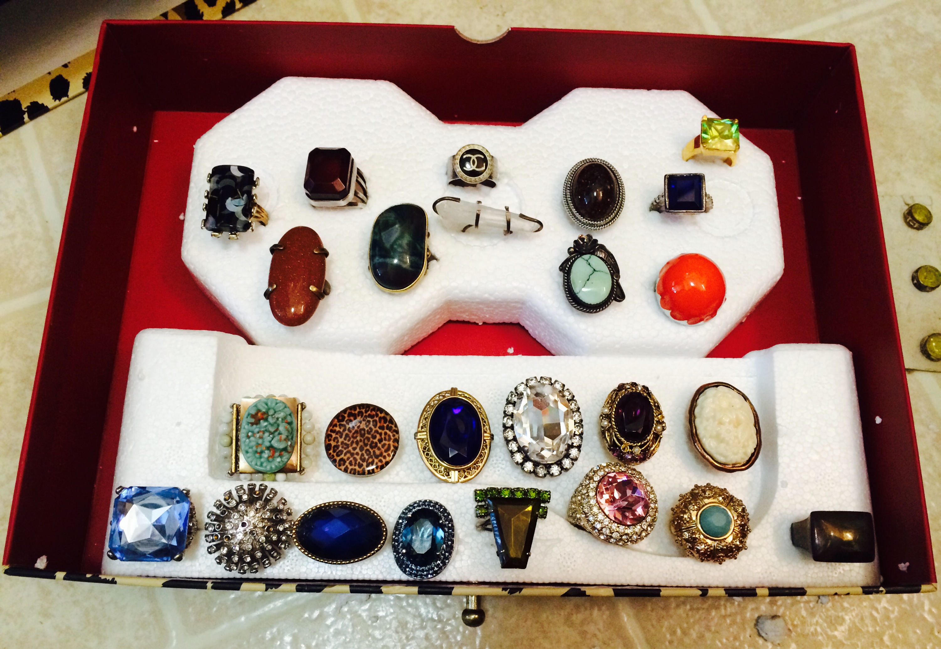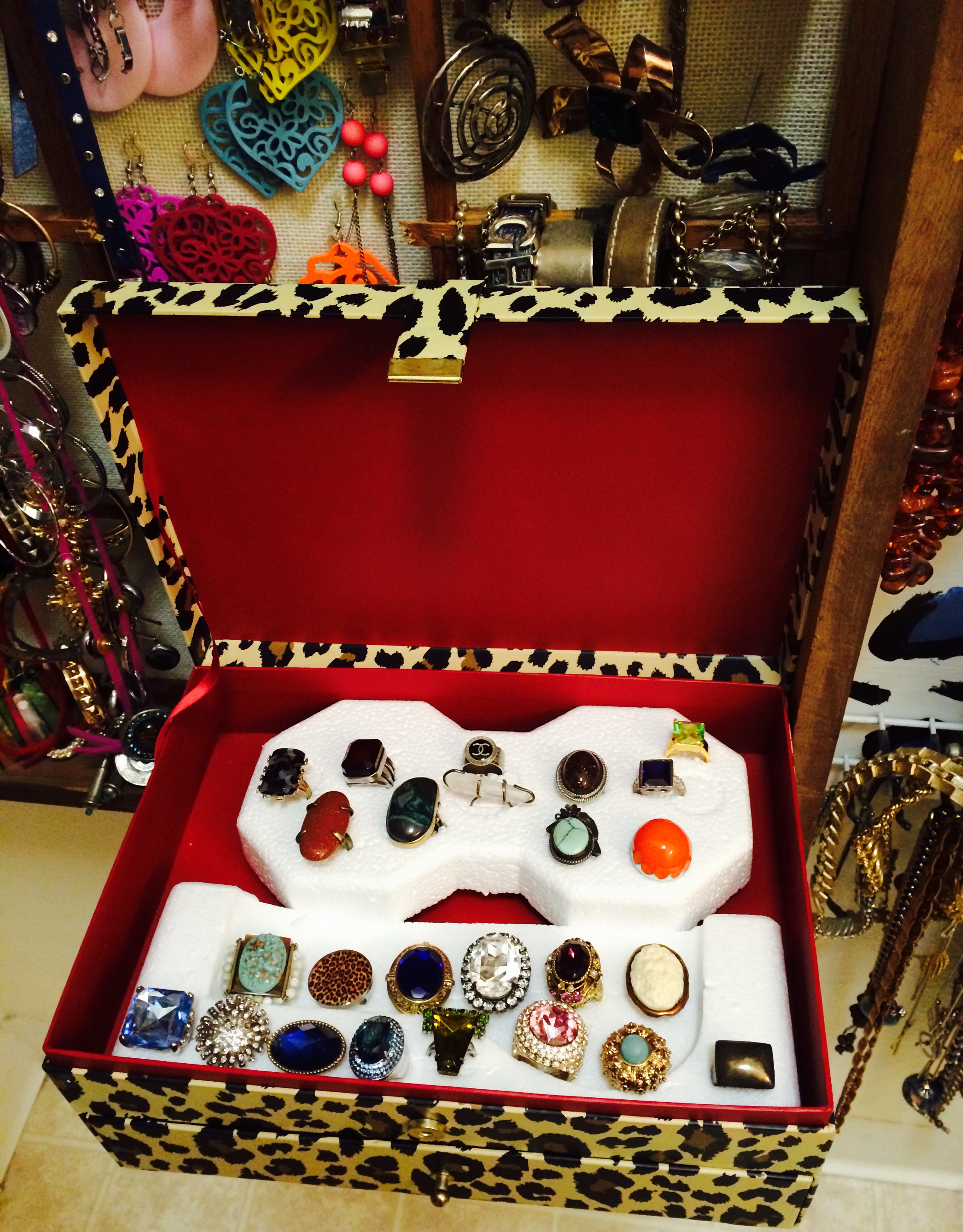 When all was said & done, my rings now fit securely in my LEOPARD jewelry box. The box sits on two metal slats which have been attached to one of my very large jewelry display cases.