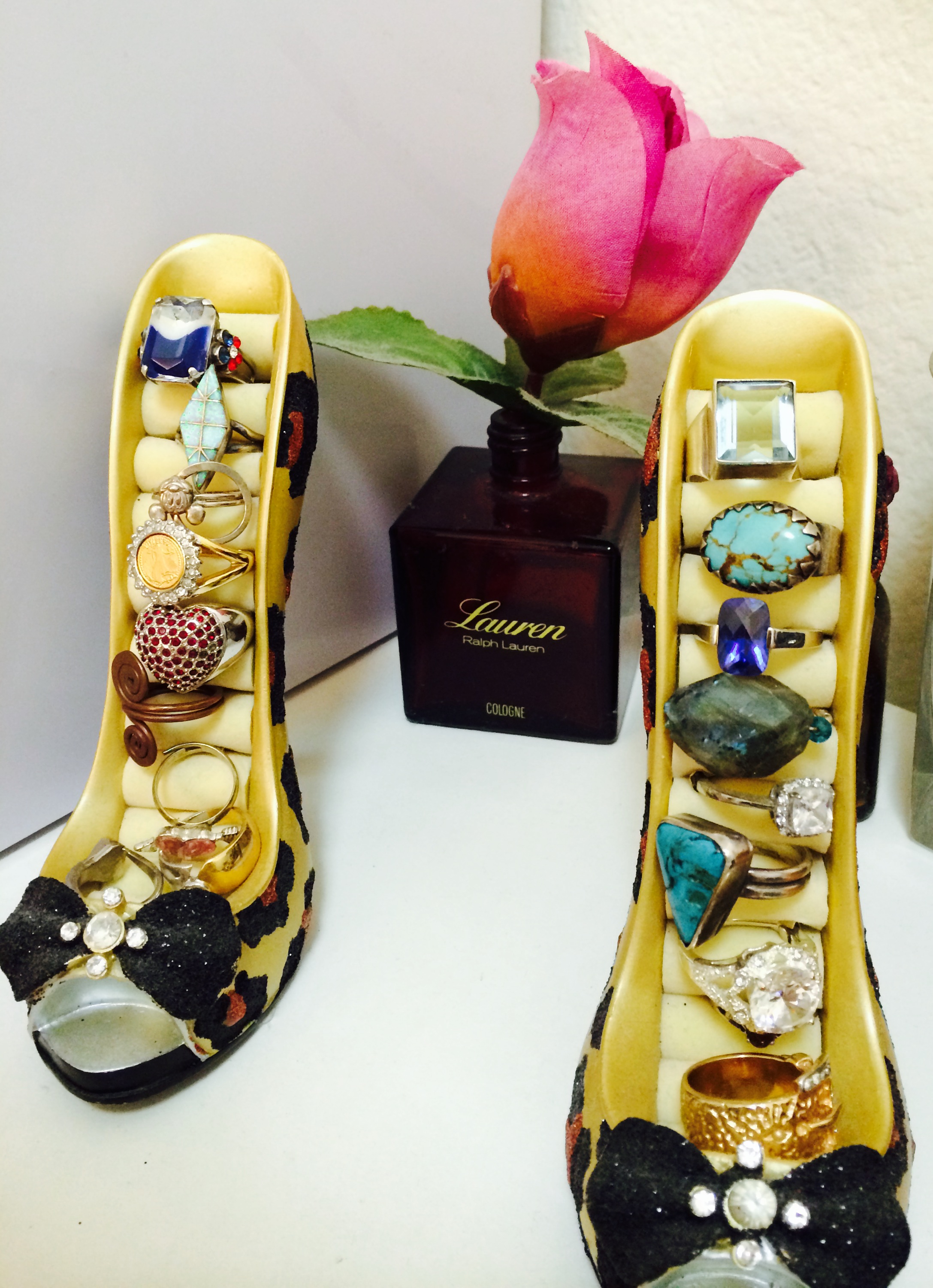 Some of my smaller rings are housed in my LEOPARD shoe-shaped ring holders.