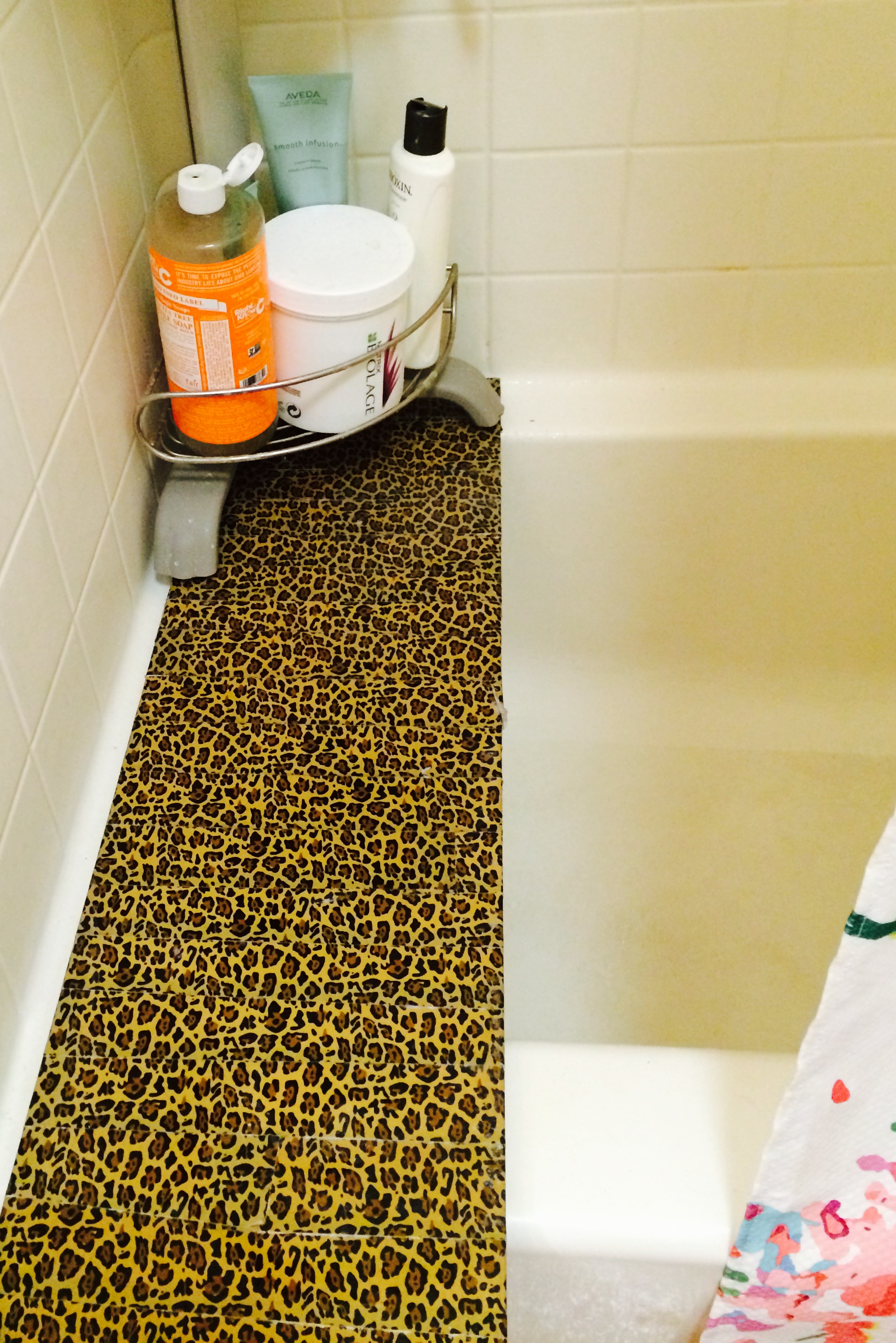 Aside from my LEOPARD cell phone case, I have tons of leopard blankets, pillows, shoes, belts, & I even covered a piece of wood with LEOPARD duct tape to use as a shelf in my bathtub. This LEOPARD piece goes across my tub & supports my corner bathroom caddy.