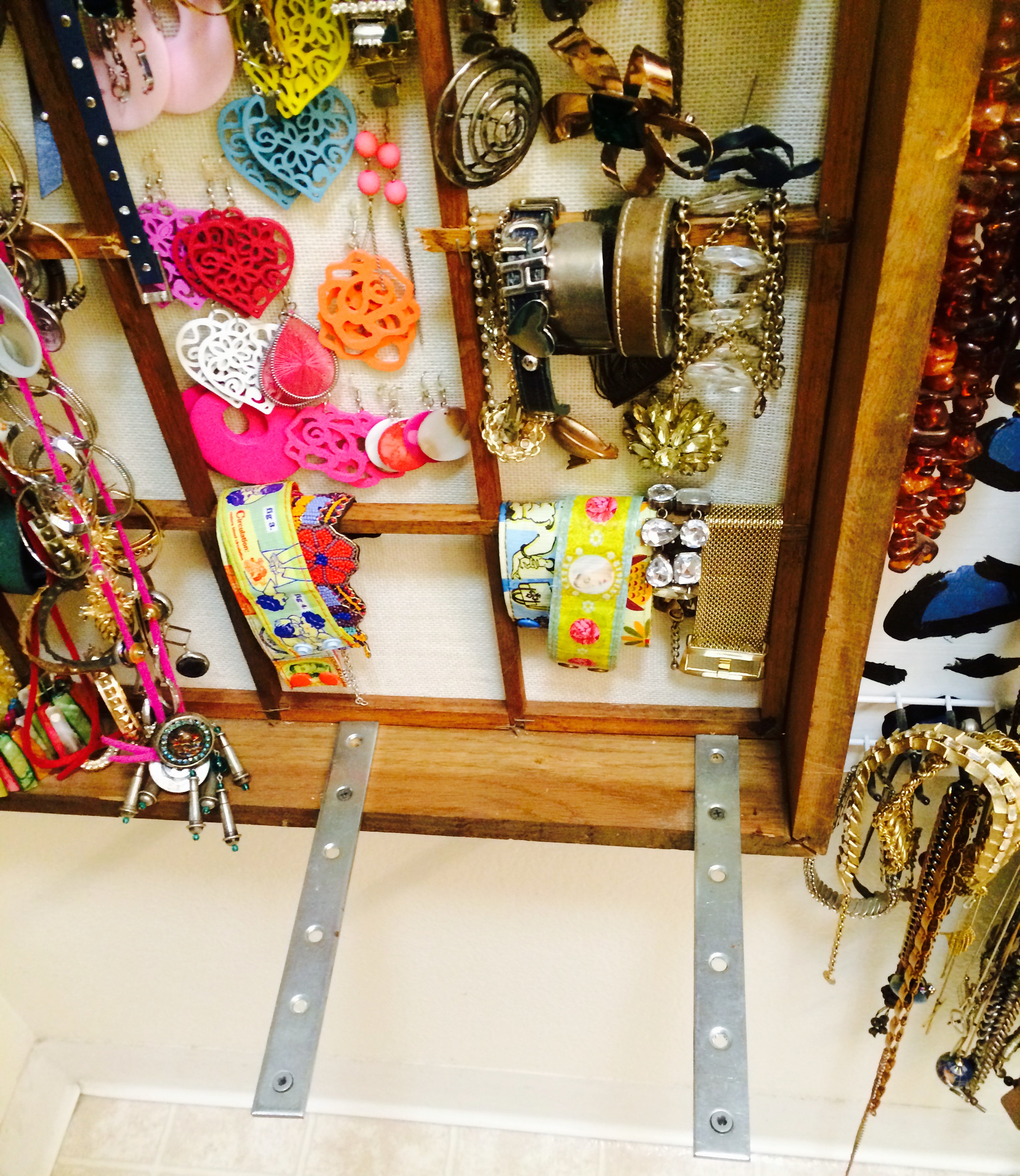 These metal things, of which I don’t yet have a name, are leftover from when I used to build stacked closets from particle board units I’d bought at Home Depot. I no longer use these heavy units as they are not “moving friendly.” Instead I’ve switched to wire metal clothing racks.